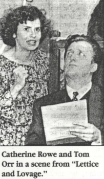 Stuart Duncan of TIME OFF says: "This is a comedy for those to whom intelligence is a joy of life." Robin Whittemore of U.S.1 says: " the talented cast includes Tom Orr as the hilarious Mr. Bardolph June Ulkoski of the New Hope Gazette says: Orr handles Bardolphs quick shift from serious lawyer to drum-beating actor with flair. Peter Spencer of the Bucks County Courier-Times says: "Tom Orr plays a priggish lawyer who melts under Lettices charm (Catherine Rowe). Orr and Rowes great mutual sensitivity turn this into the plays funniest scene." |